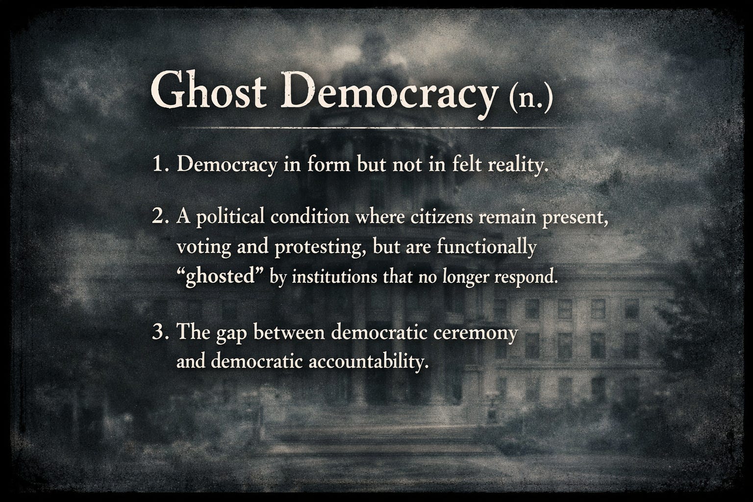 Democracy becomes a ritual where you are allowed to perform your anger in designated areas and then disappear again. A controlled burn. A pressure valve. Something the system can tolerate because it doesn’t change the system.