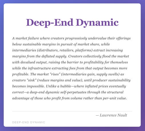 The deep-end dynamic is a parasitic market failure: intermediaries extract increasing value from creator desperation while remaining insulated from creator collapse. Risk is externalized downward. Volume is rewarded upward.